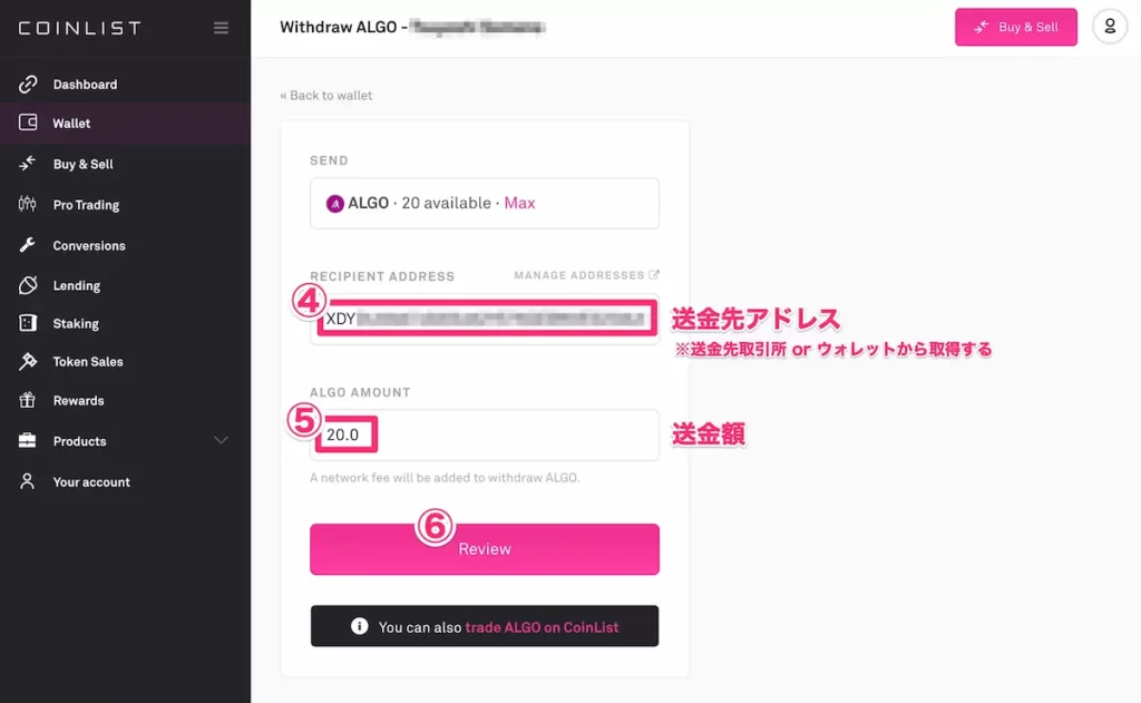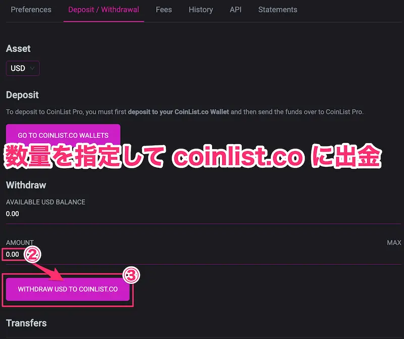CoinListProの「Balance > Withdraw」から出金ができます。