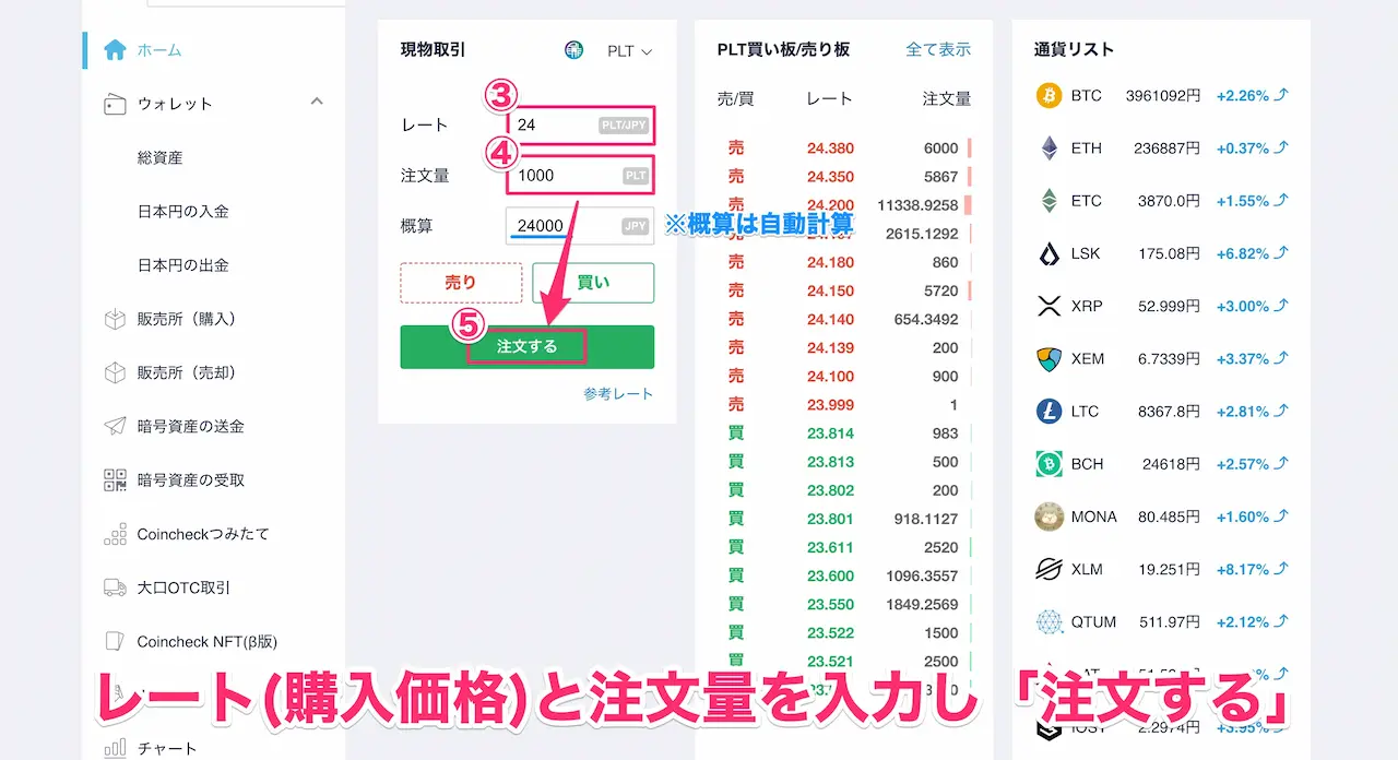 ホーム画面 > 現物取引 > PLTを開き、レート&注文量を入力するだけで、注文できます。